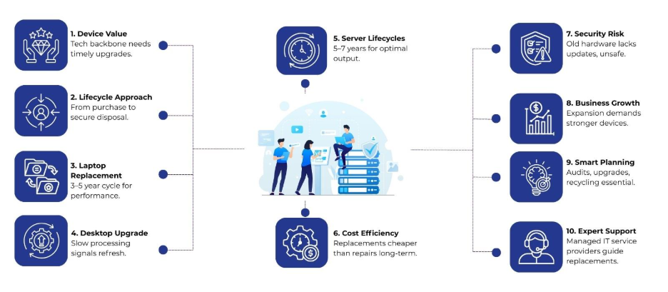 Managed IT service providers conduct audits, recommend replacement schedules, handle procurement and deployment, provide maintenance, and manage secure decommissioning.