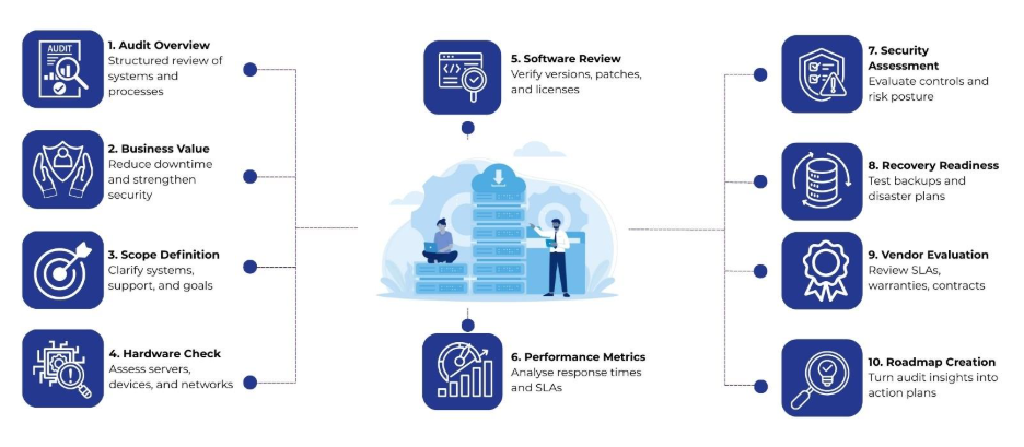Unlike general IT audits, this process focuses specifically on the support structure, i.e., help desk operations, issue resolution workflows, monitoring systems, vendor management, and disaster recovery readiness.