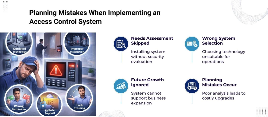 A major mistake is installing an access control system without first evaluating organizational requirements. Not all facilities require the same level of access control. Factors such as the number of entry points, user roles, and the types of areas needing protection must be considered.