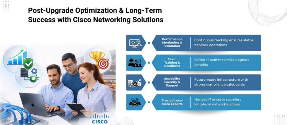 An often-overlooked aspect of a Cisco network upgrade is team readiness. Training IT staff on new hardware, software, and advanced features maximizes the benefits of the upgrade. Knowledgeable staff can:
